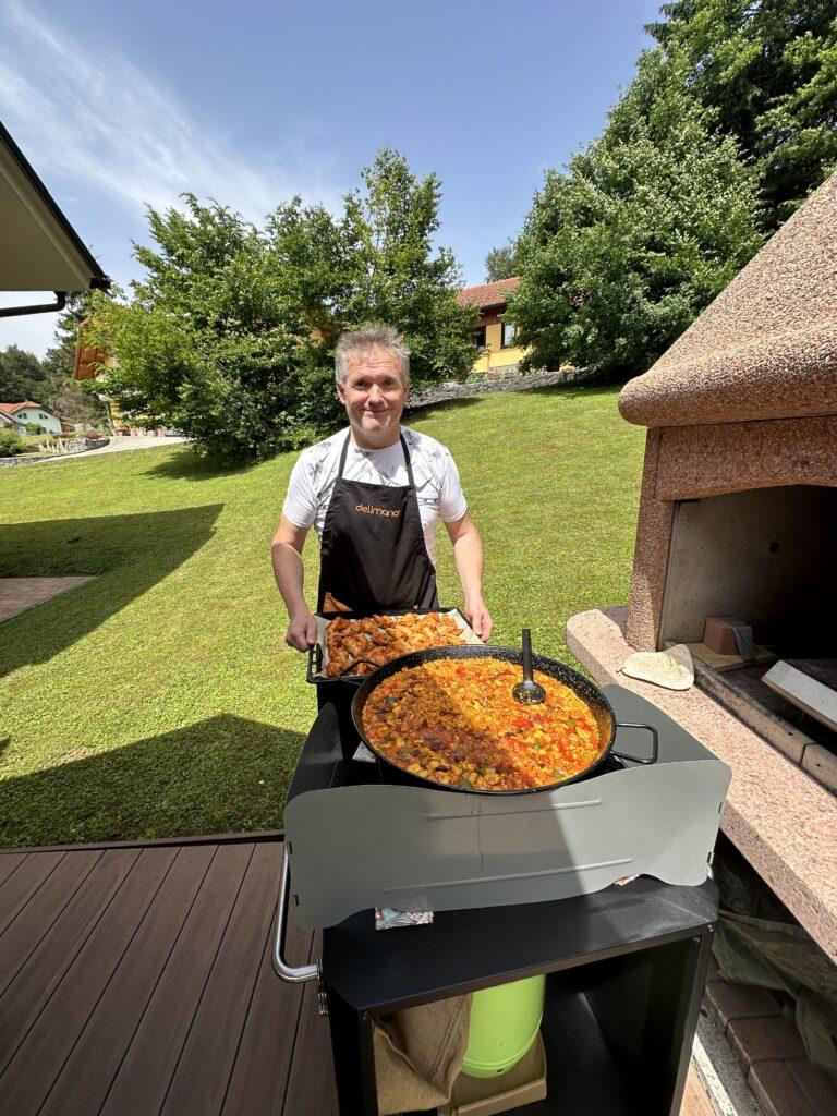 Jaz sem resnično nora na jedi iz riža. Riž bi lahko jedla vsak dan. Njaraje pa imam kakšne kremne rižote, kitajski pražen riž ali džuveč riž in seveda paello. Paella izvira iz Španije in nekateri pravijo, da je njen dom Valencija. Vsaka španska kuharca ima seveda svoj recept, isto kot v grčiji saganaki in v italiji pašto,… Kar imaš lahko uporabiš za to jed s kratko zrnatim rižem. Najboljša jed je, če se dela v posebni ponvi na odprtem ognju. Tako ima tudi naš prijatelj Matej in ni je boljše paelle kot jo naredi on. Ker pa on rad deli svoje jedi in dobroto, je z mano in z vami delil tudi ta recept. Zato hvala Matej, se oddolžim 😉