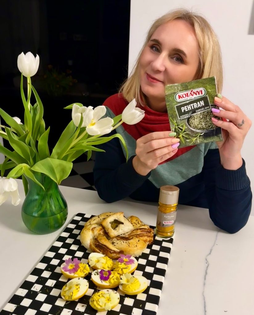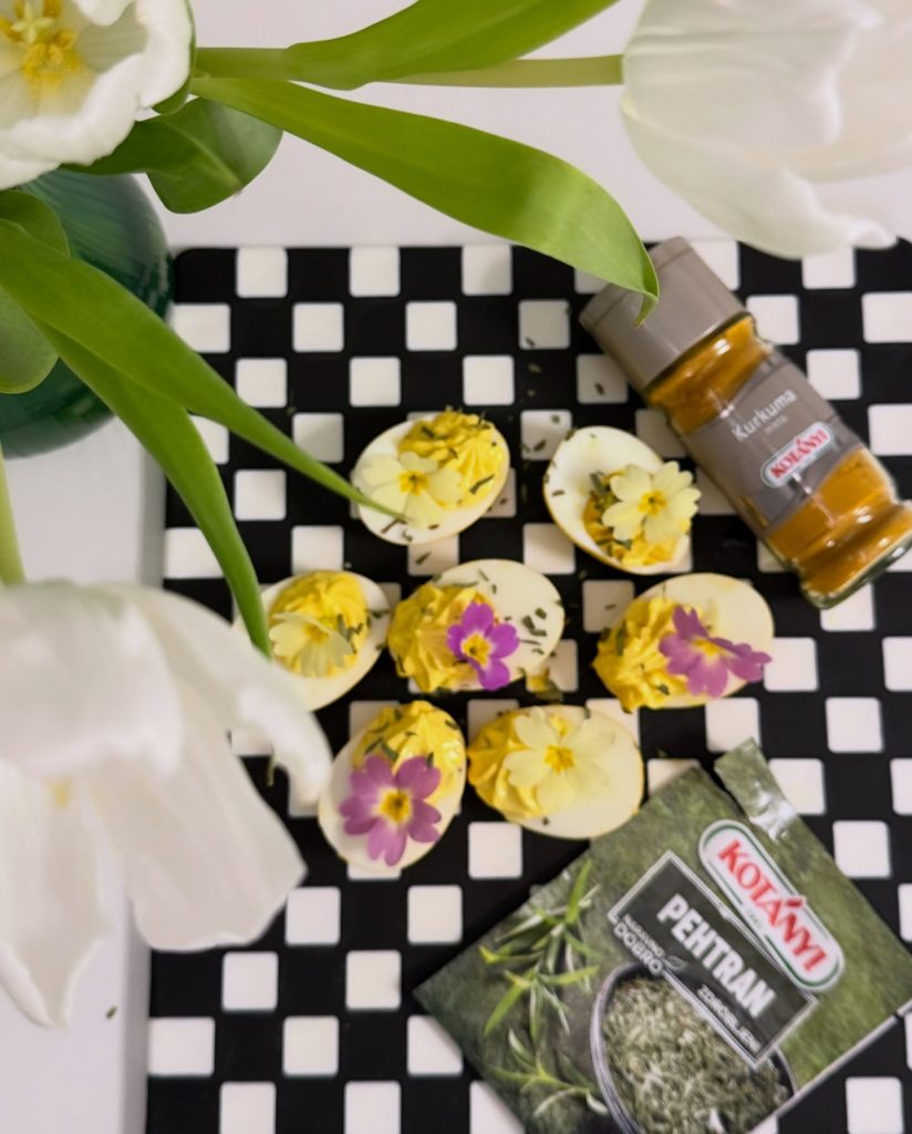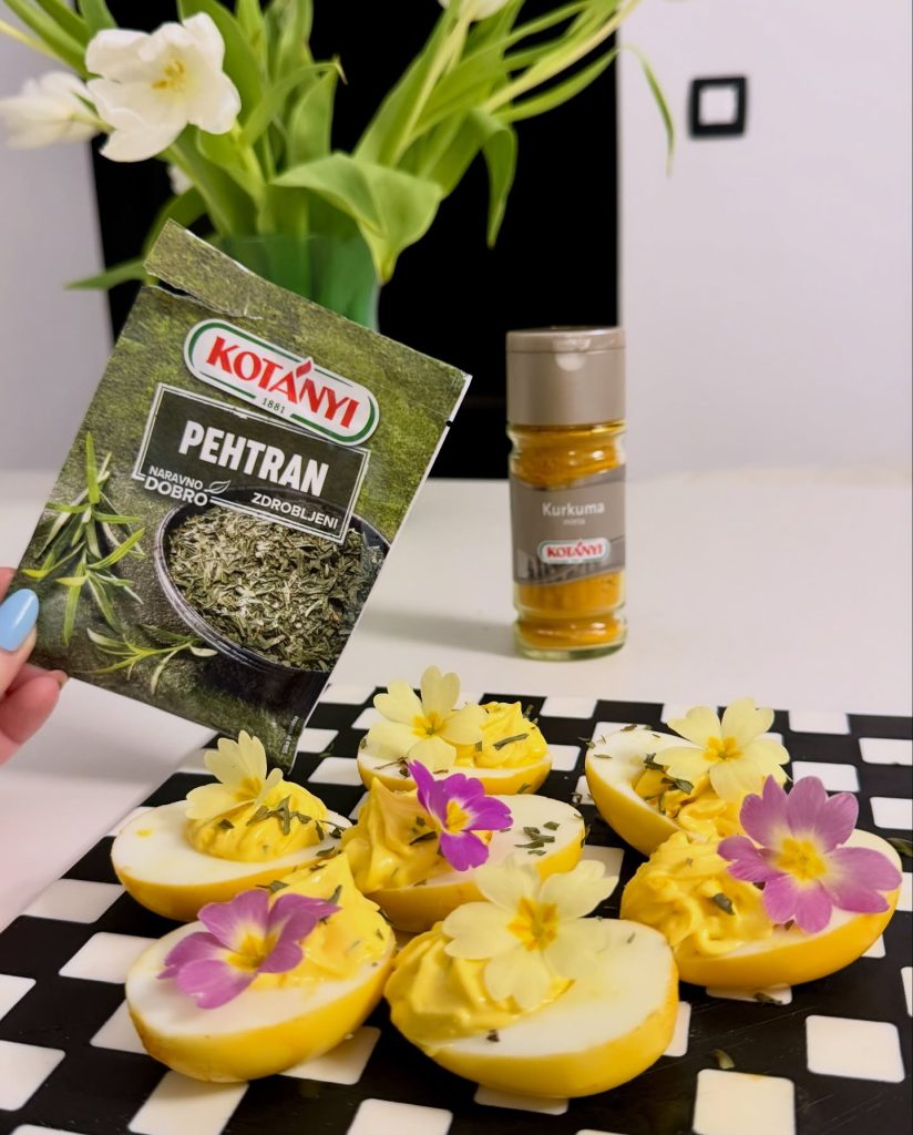 🥚 VELIKONOČNA JAJCA S PEHTRANOM 1. Trdo kuhana jajca → olupljena 2. Namakaš 30 min v Kotanyi kurkumi (več kurkume = bolj intenzivna barva ✨) 3. Rumenjake zmešaš z: